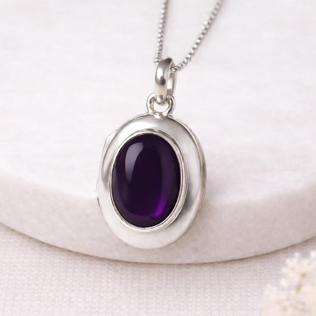 Each locket is thoughtfully made using traditional jewellery techniques, with a smooth, weighty feel that reflects its quality and durability. The oval locket opens to reveal space for two photos, making it a deeply personal keepsake piece, perfect for holding loved ones, memories, or meaningful moments. The smooth silver surround is intentionally kept minimal to allow the amethyst to take centre stage.