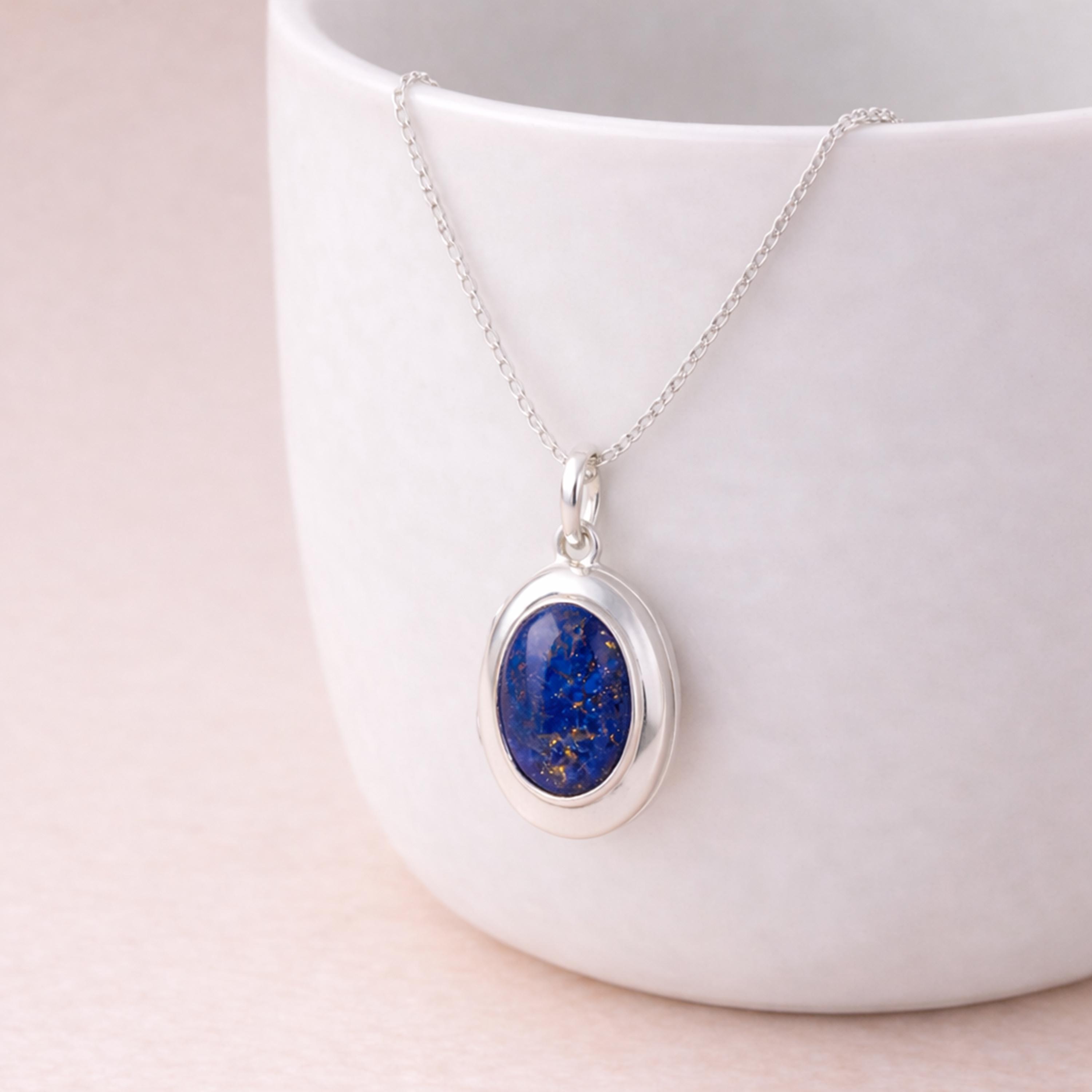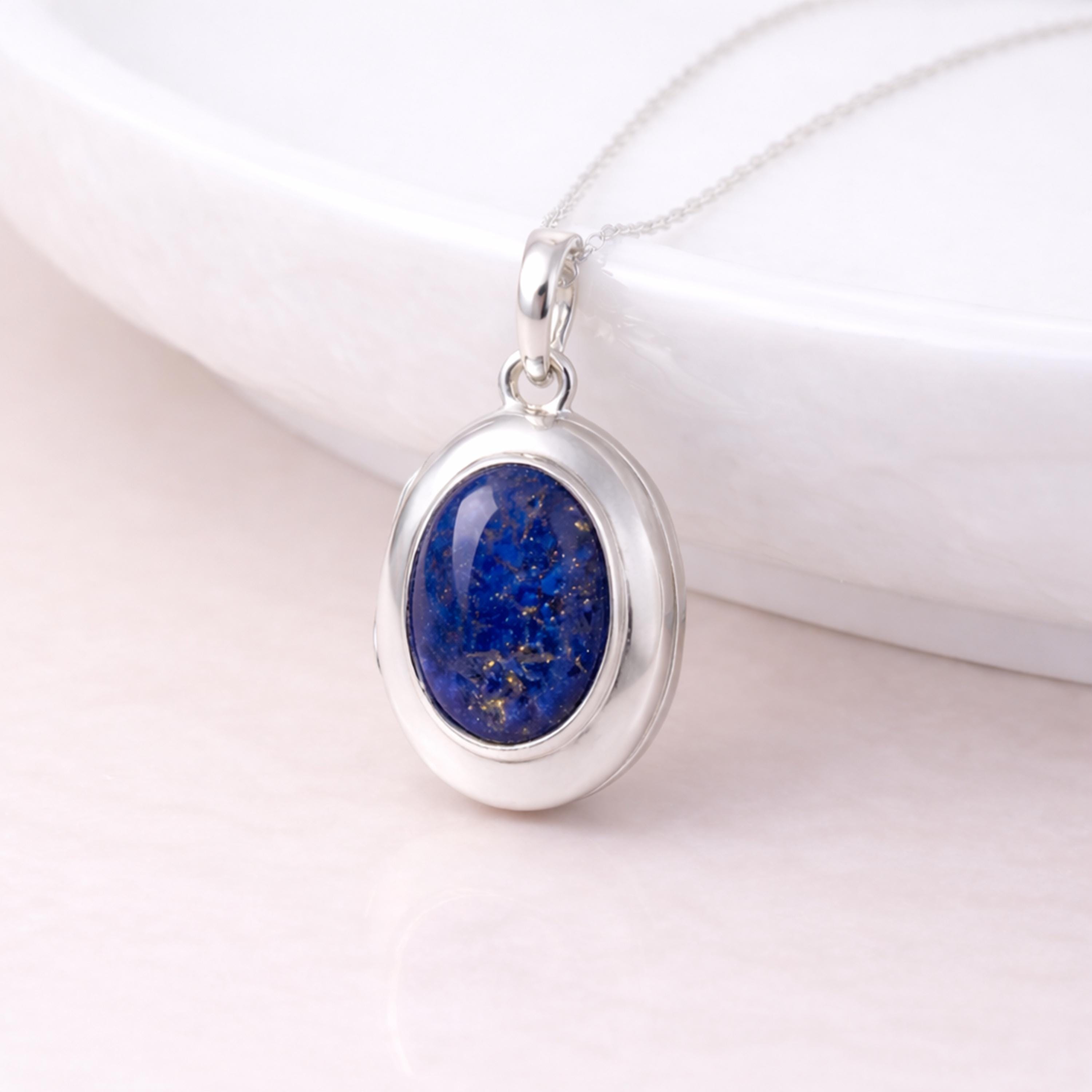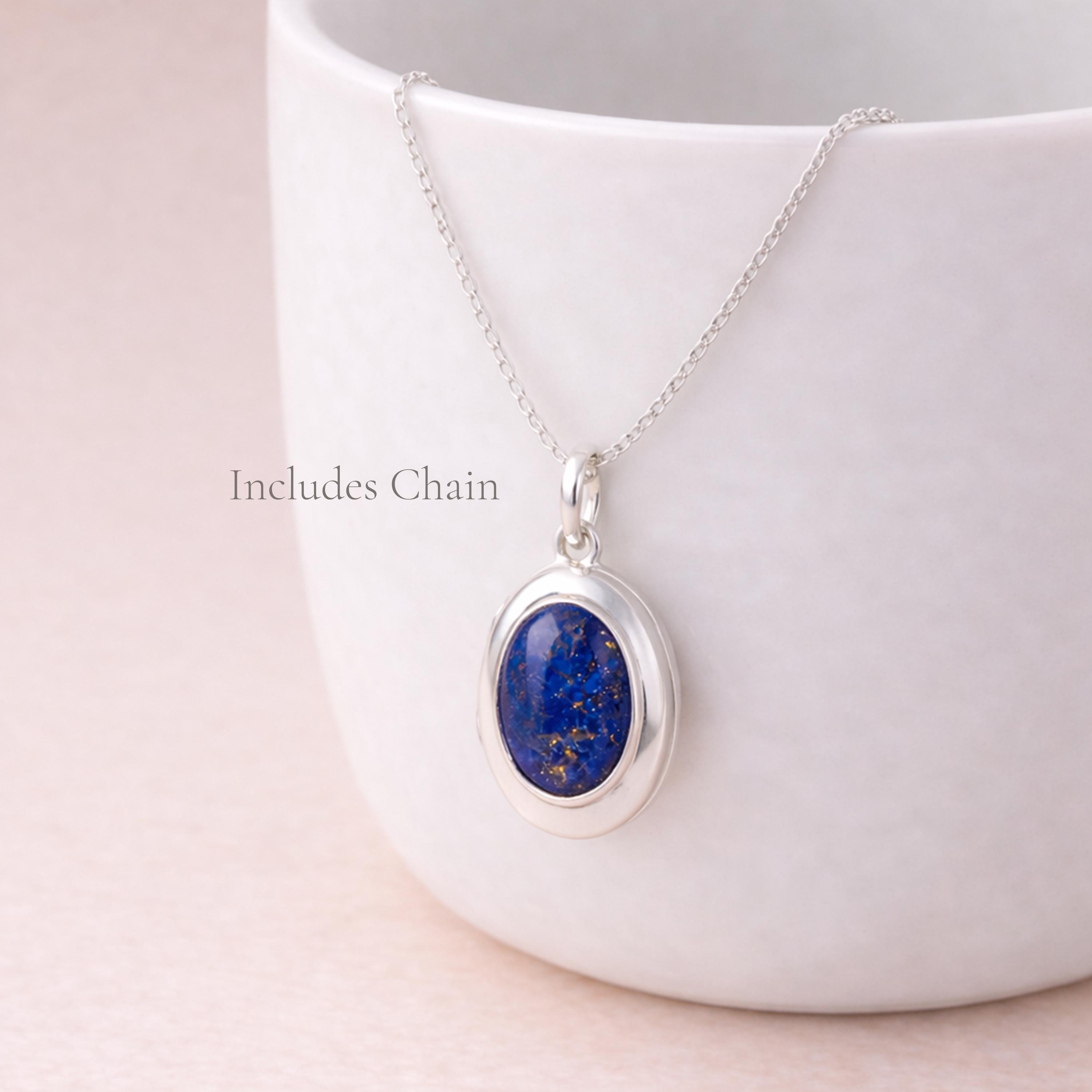 Perfect as a lapis lazuli locket, September birthstone gift, or personalised keepsake necklace, this design blends classic style with meaningful detail.