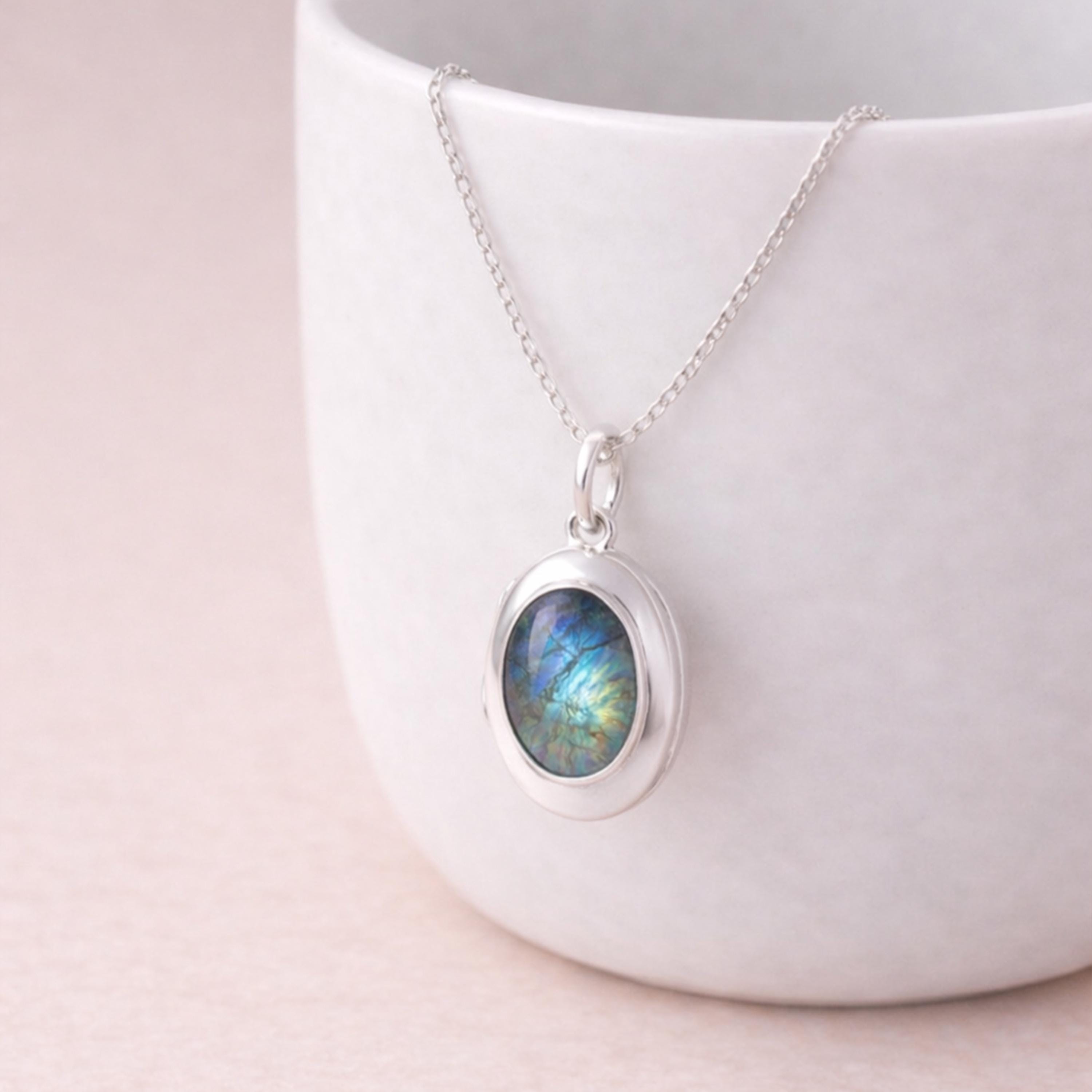 Perfect as a labradorite locket, natural gemstone necklace, or personalised keepsake gift, this piece blends depth, movement, and timeless sentiment.