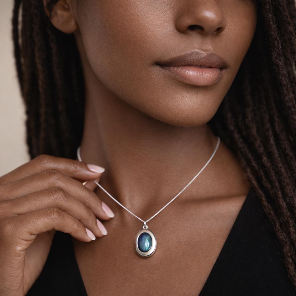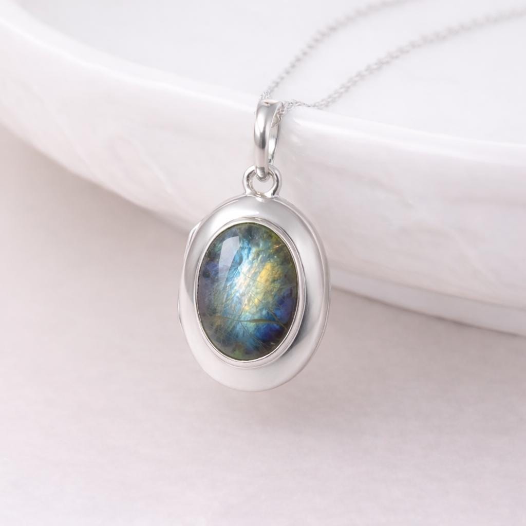 Each locket is thoughtfully made using traditional jewellery techniques, with a smooth, weighty feel that reflects its quality and durability. The oval locket opens to reveal space for two photos, making it a deeply personal keepsake piece, perfect for holding loved ones, memories, or meaningful moments. The smooth silver surround is intentionally kept minimal to allow the labradorite to take centre stage.