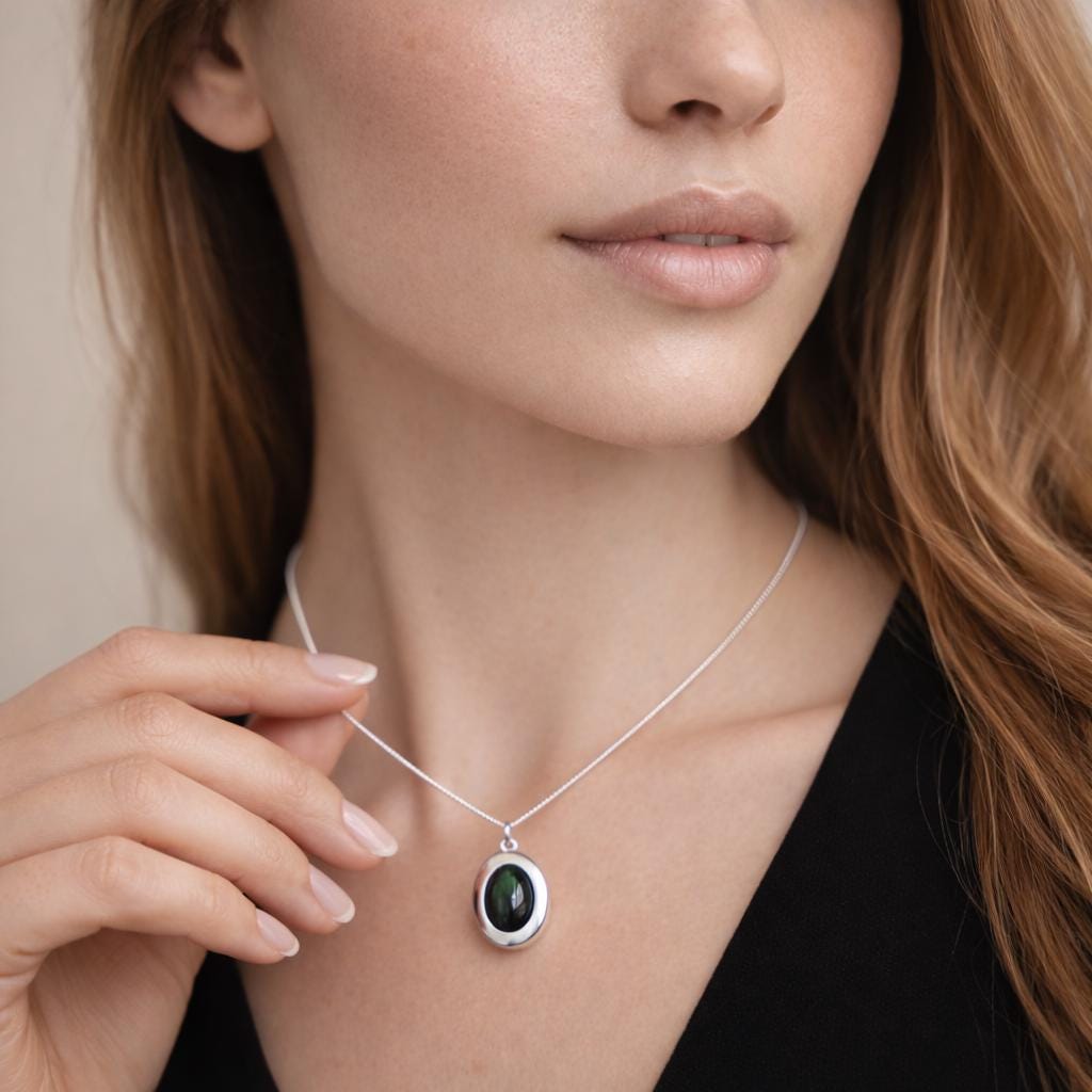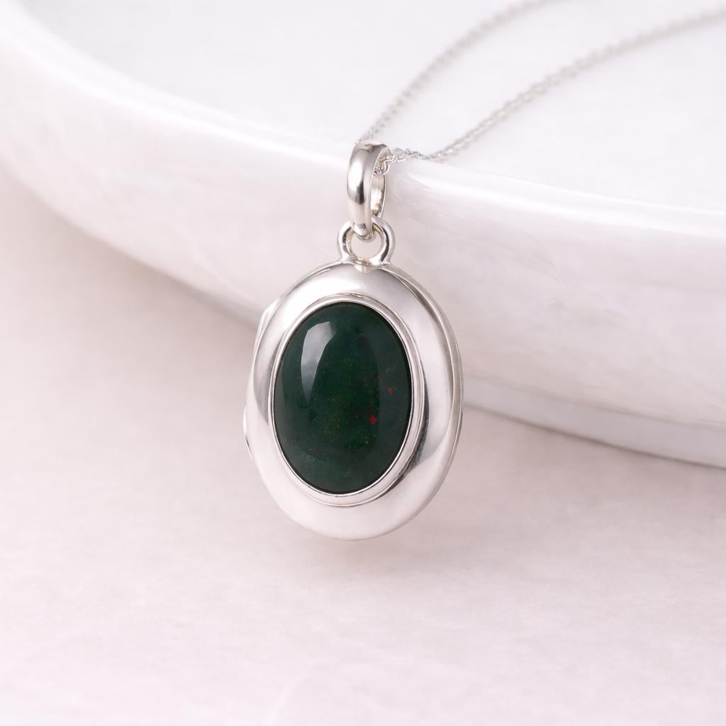 Each locket is thoughtfully made using traditional jewellery techniques, with a smooth, weighty feel that reflects its quality and durability. The oval locket opens to reveal space for two photos, making it a deeply personal keepsake piece, perfect for holding loved ones, memories, or meaningful moments. The smooth silver surround is intentionally kept minimal to allow the bloodstone to take centre stage.